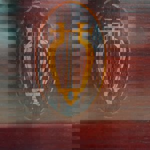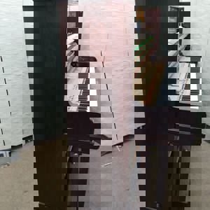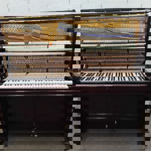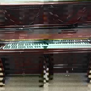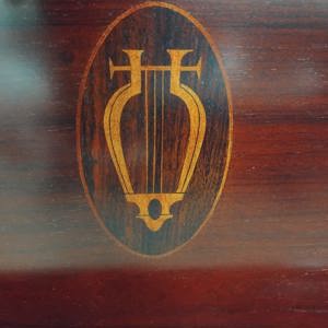 It has a Rosewood veneered case and a lovely silk finish. Its front panel displays a pretty harp motif, made from inlayed fruitwood veneers.