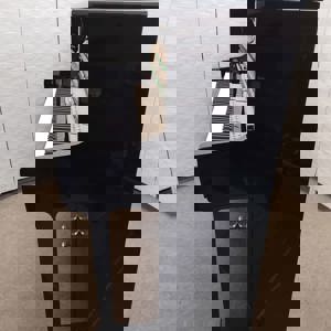 Its casework is in high gloss, black polyester and has chromework features throughout. The case has a soft close fall board.