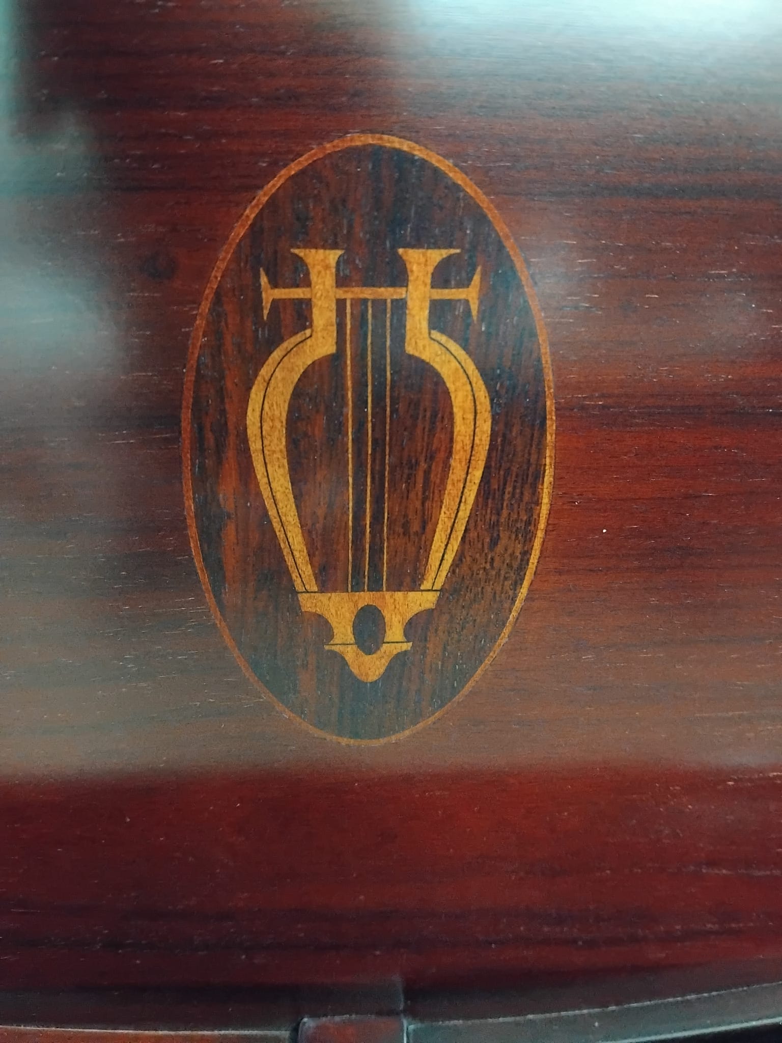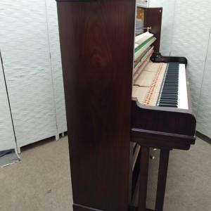 It has a Rosewood veneered case and a lovely silk finish. Its front panel displays a pretty harp motif, made from inlayed fruitwood veneers.